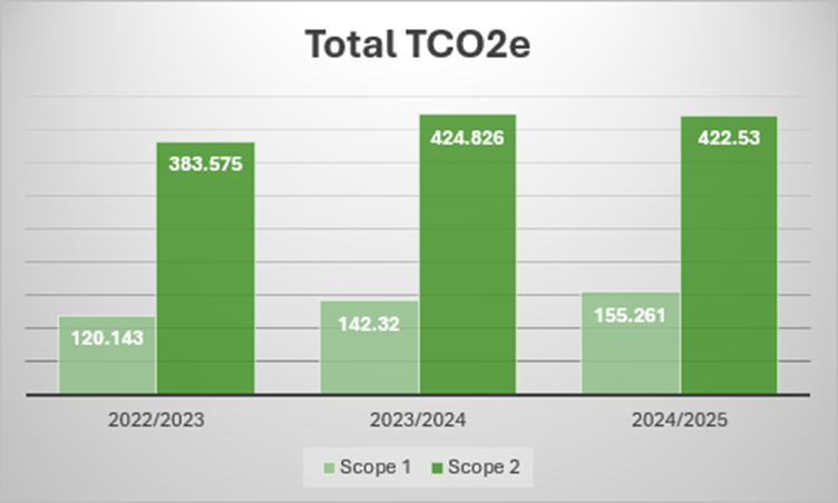 Reducing our carbon footprint and addressing climate change are central to our sustainability strategy. We report Scope 1 and Scope 2 emissions in line with SECR requirements and are actively working to collect and improve Scope 3 data across our core categories. Through innovative solutions and efficiency initiatives, we strive to create a more sustainable future. Our benchmark year was 2022/23, and while infrastructure growth led to higher emissions in 2023/24, the impact of our efficiency measures is now evident in the reduction achieved during 2024/25.