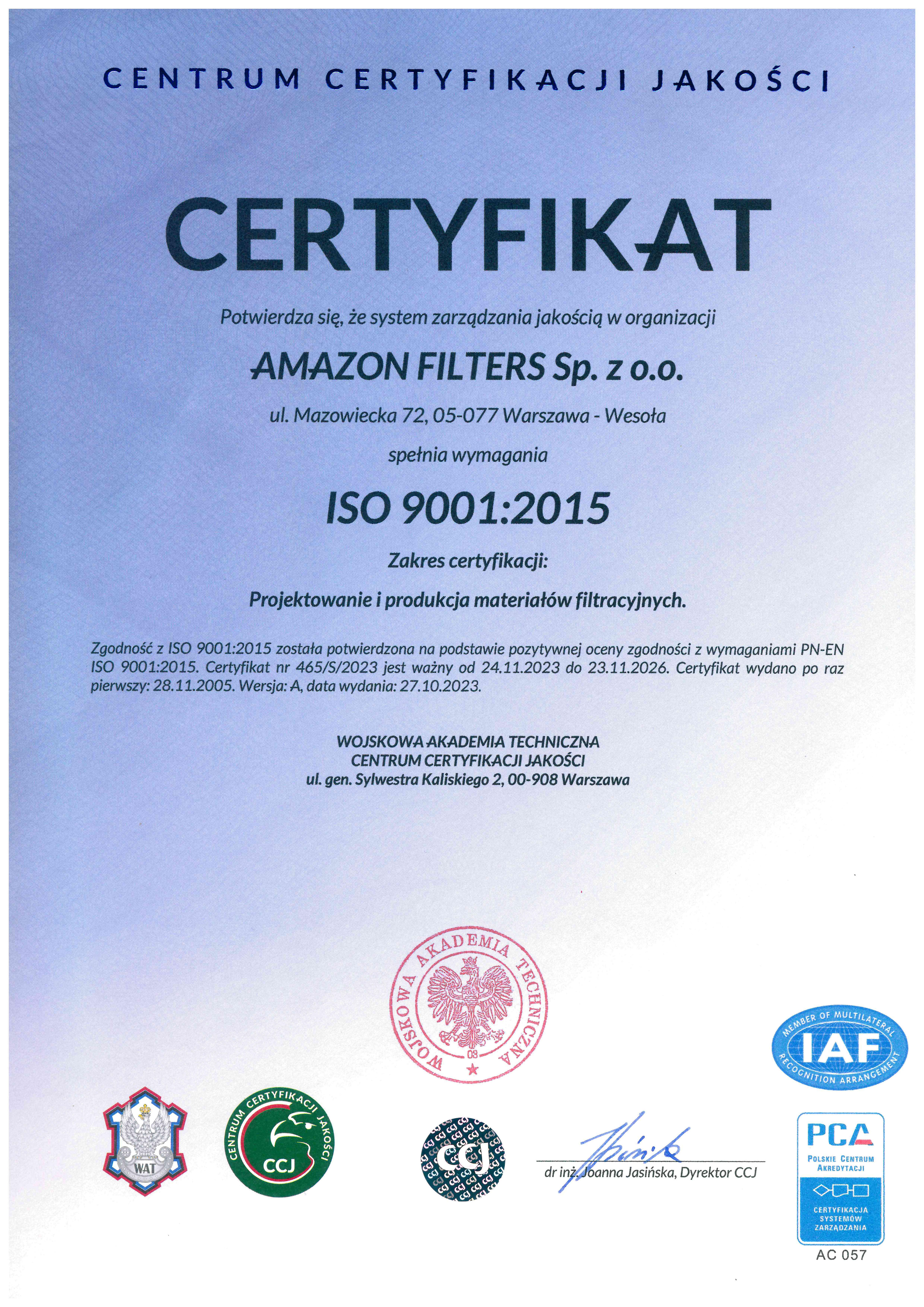 Amazon Filters Sp. z o.o. posiada certyfikat ISO 9001-2015 o numerze 465/S/2023, którego zakres obejmuje „Projektowanie i produkcję materiałów filtracyjnych”..