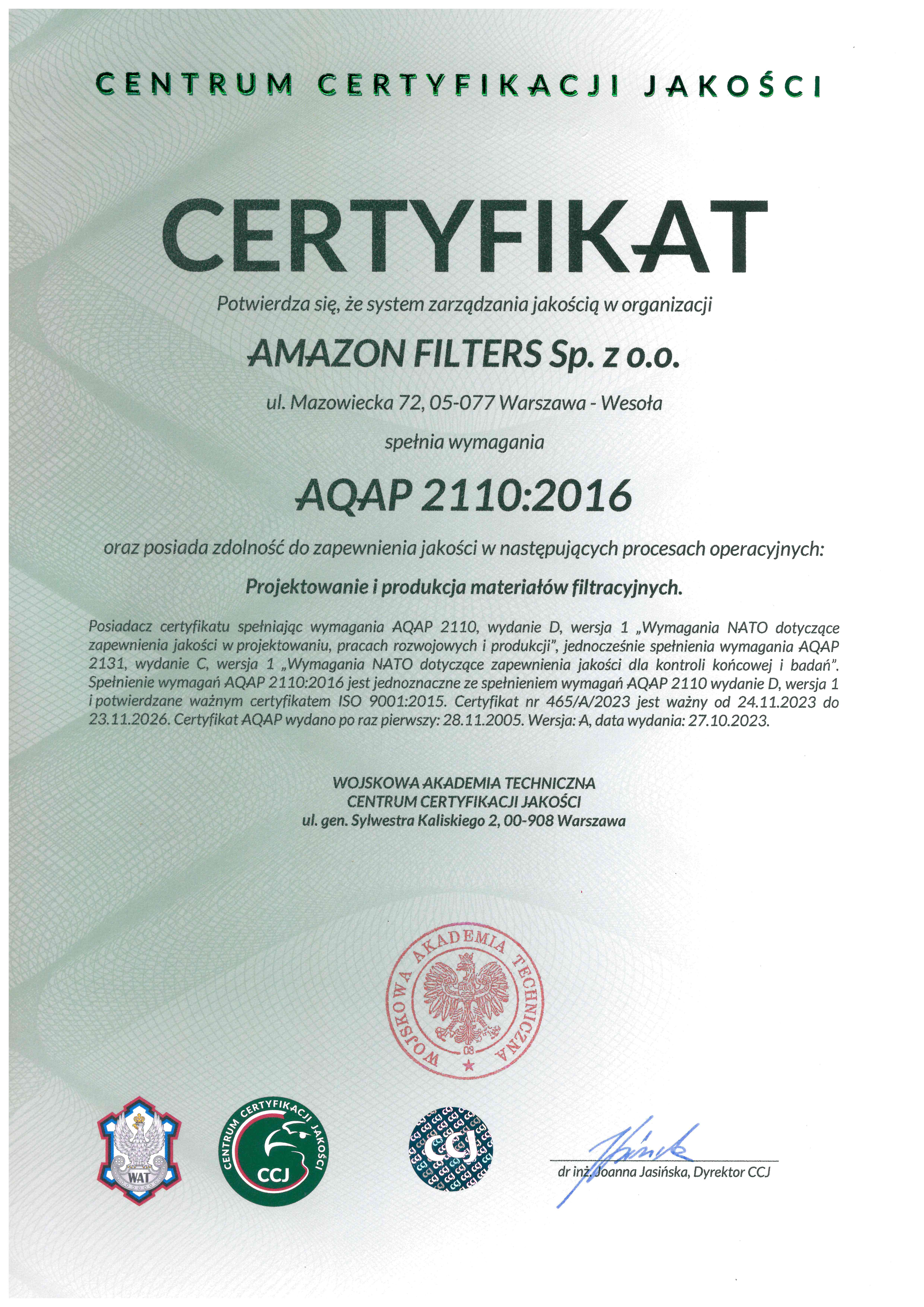Posiadamy także certyfikat AQAP 2110:2016, o numerze 465/A/2023 potwierdzający zdolność do zapewnienia jakości w następujących procesach operacyjnych: „Projektowanie i produkcja materiałów filtracyjnych”.